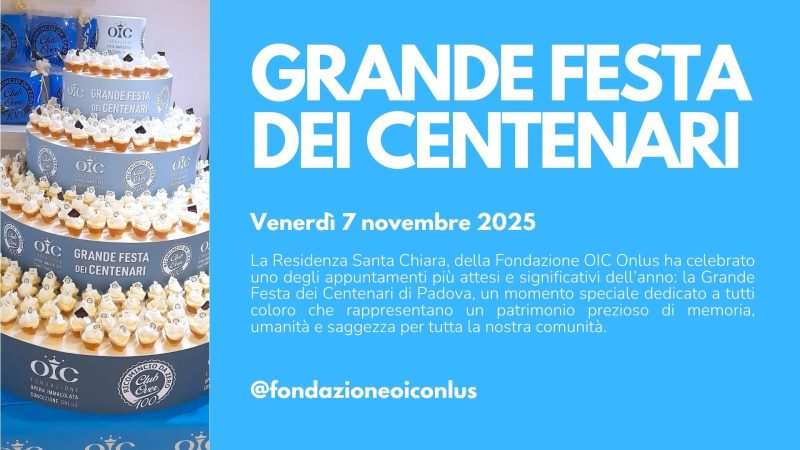 La Residenza Santa Chiara della Fondazione Opera Immacolata Concezione Onlus ha celebrato venerdì 7 novembre, uno degli appuntamenti più attesi dell’anno: la Grande Festa dei Centenari, un evento dedicato agli ospiti che hanno raggiunto e superato il traguardo dei cento anni, riconosciuti come autentico patrimonio di saggezza e memoria per la comunità. Alla celebrazione hanno partecipato il Vicesindaco del