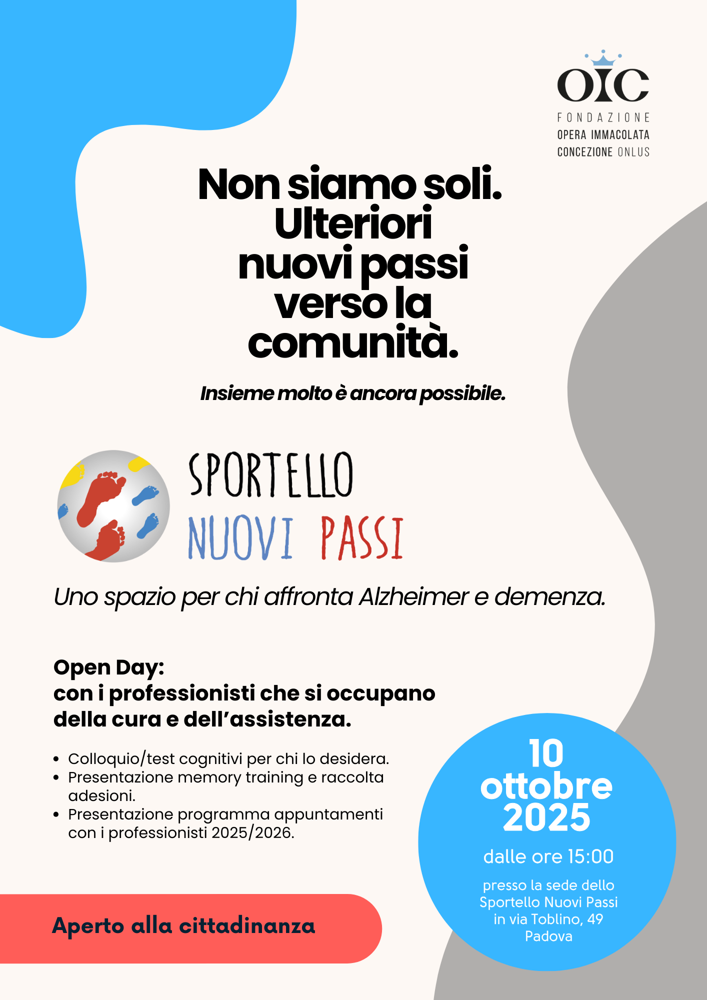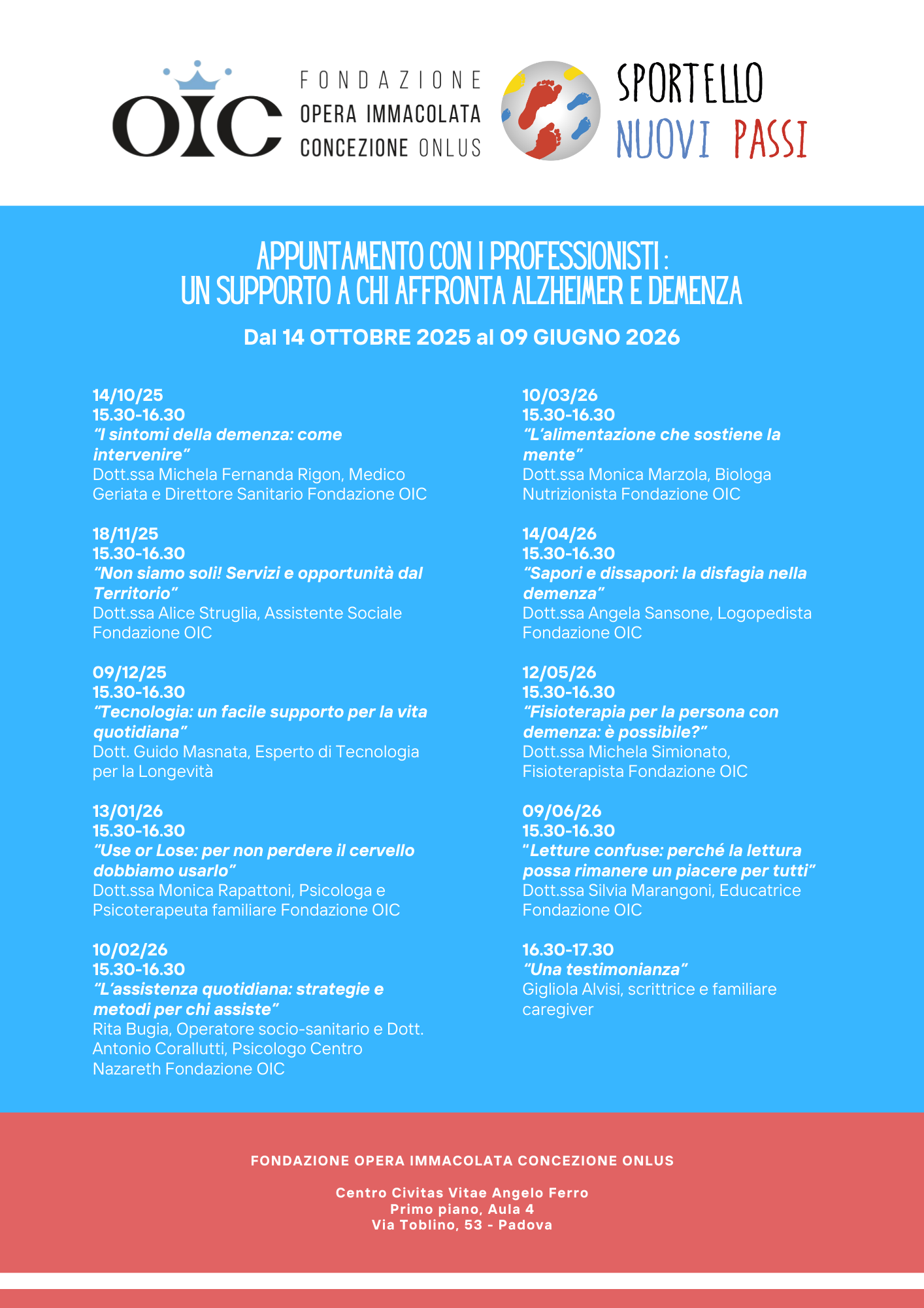 Dal 14 ottobre 2025 al 9 giugno 2026, lo Sportello Nuovi Passi della Fondazione OIC Onlus propone un ciclo di appuntamenti gratuiti con i professionisti, pensato per fornire informazioni, strumenti e sostegno concreto a chi vive accanto a persone con Alzheimer e demenza.