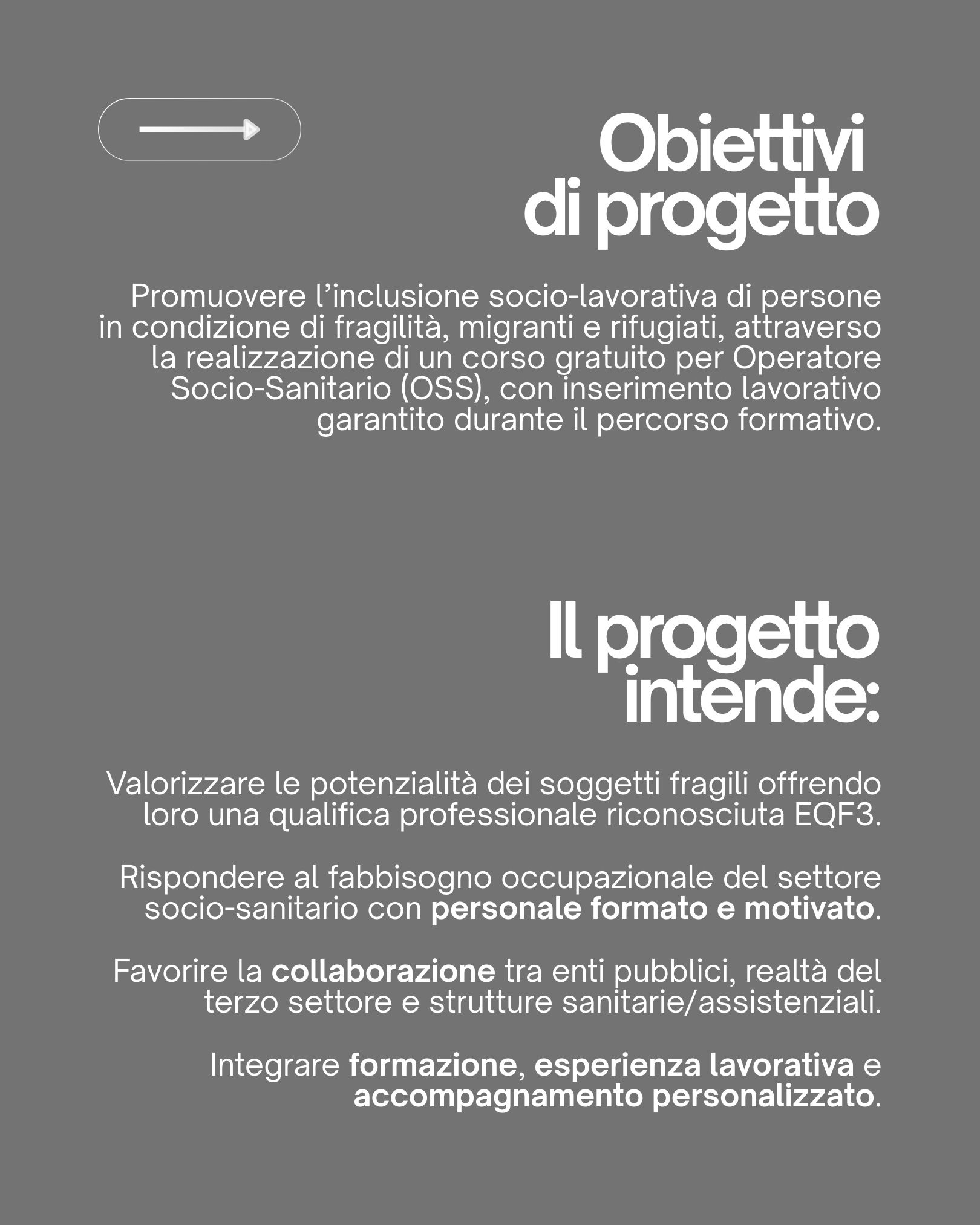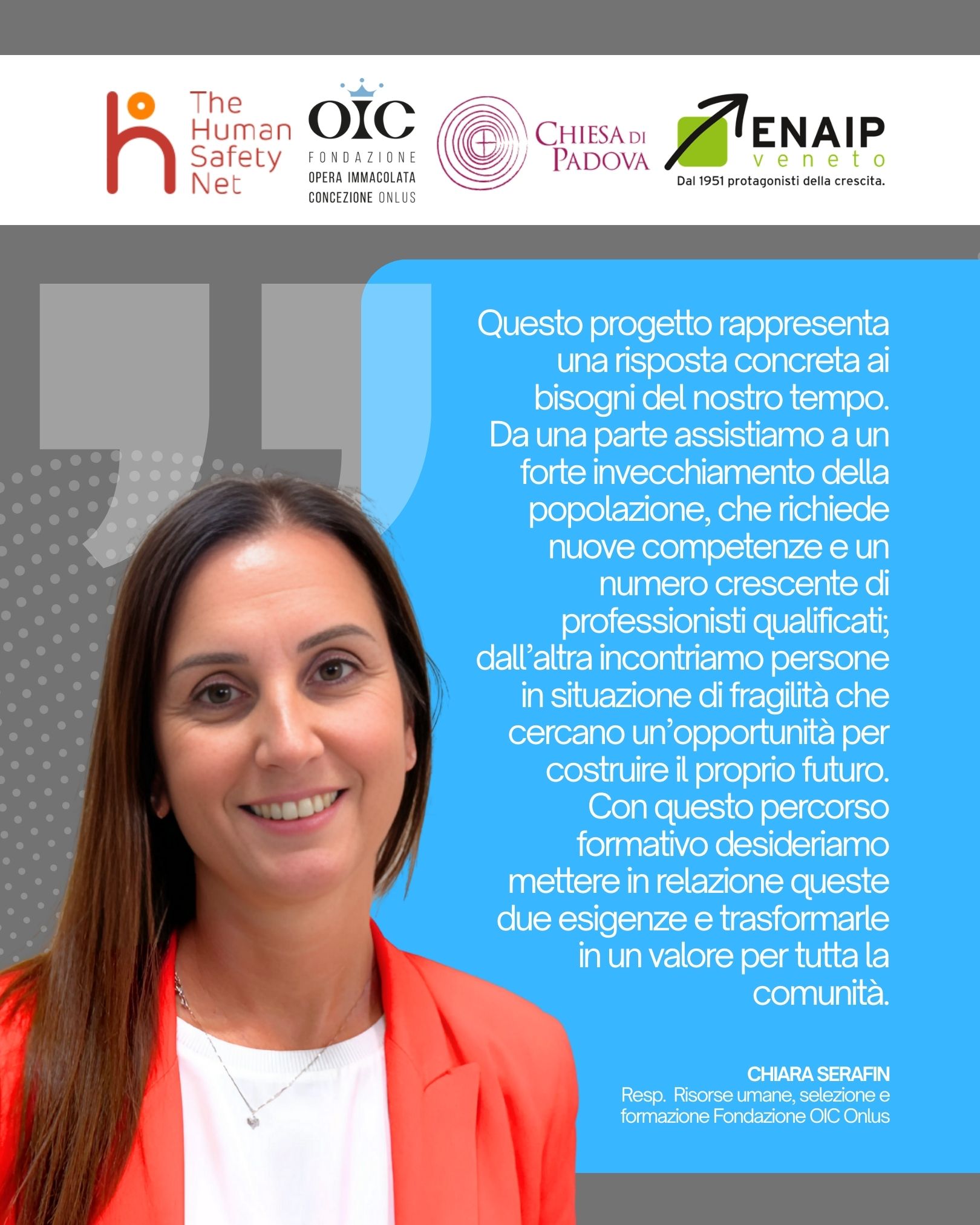 «Questo progetto rappresenta una risposta concreta ai bisogni del nostro tempo. Da una parte assistiamo a un forte invecchiamento della popolazione, che richiede nuove competenze e un numero crescente di professionisti qualificati; dall’altra incontriamo persone in situazione di fragilità che cercano un’opportunità per costruire il proprio futuro. Con questo percorso formativo desideriamo mettere in relazione queste due esigenze e trasformarle in un valore per tutta la comunità.»