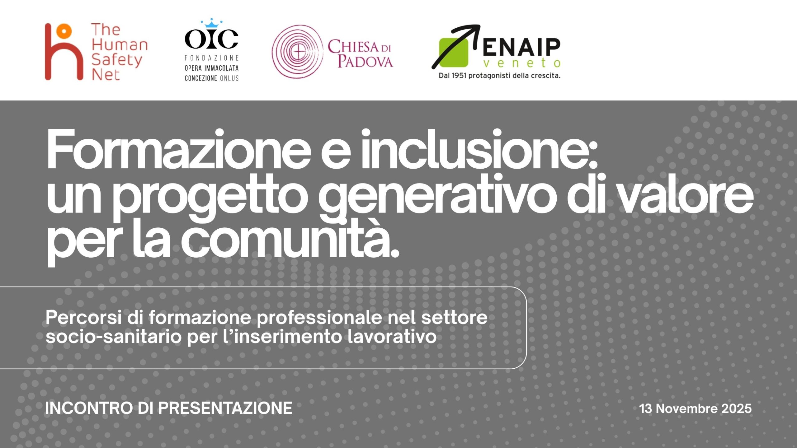 Formazione e inclusione: un progetto generativo di valore per la comunità. Corso gratuito per Operatore Socio-Sanitario dedicato a persone in situazione di fragilità, con l’impegno congiunto di Fondazione OIC, ENAIP Veneto, Caritas Padova e The Human Safety NetFormazione e inclusione: un progetto generativo di valore per la comunità.