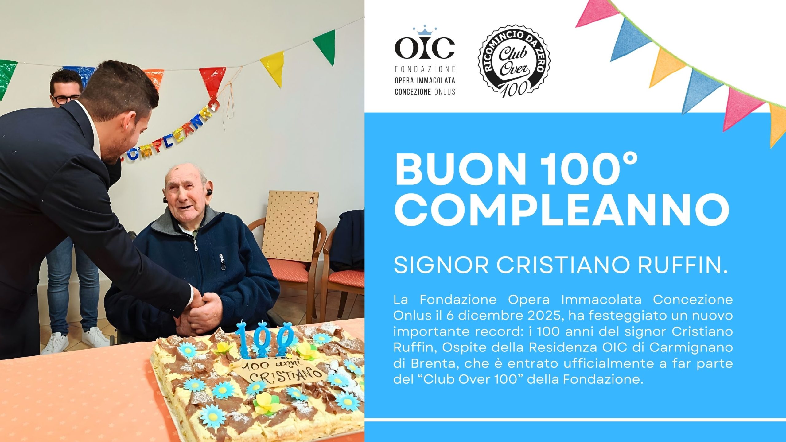 La Fondazione Opera Immacolata Concezione Onlus il 6 dicembre 2025, ha festeggiato un nuovo importante record: i 100 anni del signor Cristiano Ruffin, Ospite della Residenza OIC di Carmignano di Brenta, che è entrato ufficialmente a far parte del “Club Over 100” della Fondazione.
