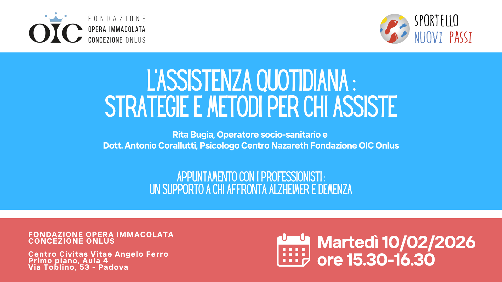 Nuovo incontro con i professionisti della Sportello Nuovi Passi della Fondazione OIC Onlus: martedì 10 febbraio 2026 – L’assistenza quotidiana: strategie e metodi per chi assiste.