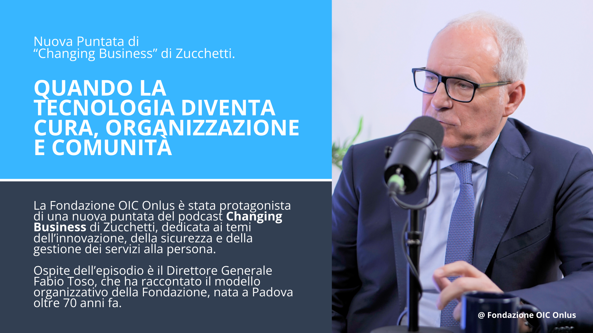 A guidare l’episodio è il dialogo tra Filippo Poletti, giornalista e comunicatore – che ama definirsi “curioso di capire come si costruisce il futuro, un processo alla volta” – e il Direttore Generale della Fondazione OIC, Fabio Toso.