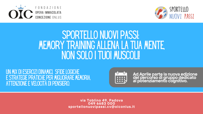 Allenare il corpo è importante. Allenare la mente lo è altrettanto.Per questo, a partire dal mese di aprile, riparte il percorso di Memory Training promosso dallo Sportello Nuovi Passi della Fondazione Opera Immacolata Concezione Onlus, dedicato al potenziamento cognitivo. Il percorso è pensato per tutte le persone che desiderano mantenere e migliorare le proprie capacità cognitive – come memoria, attenzione e velocità di