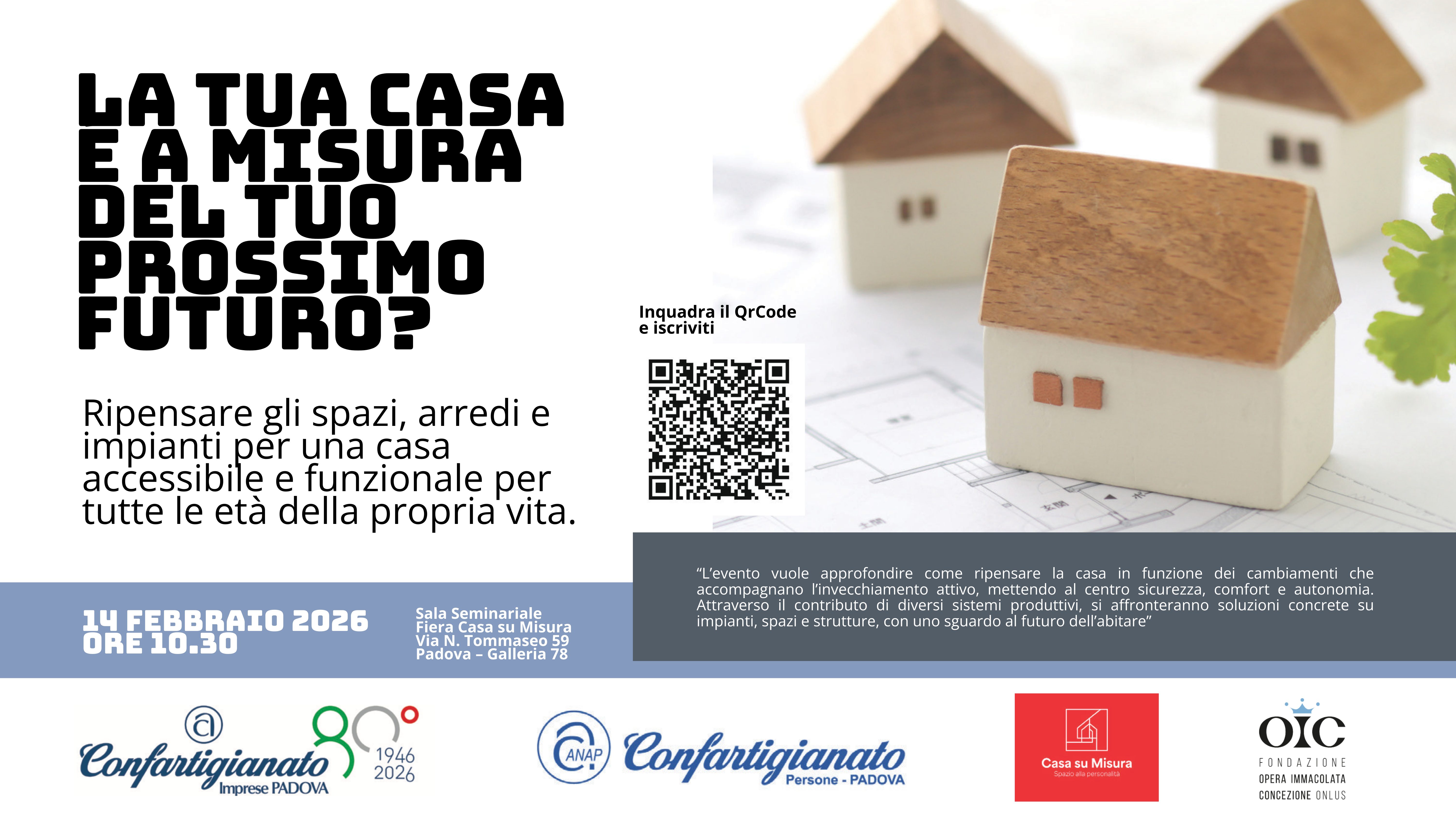È da questa consapevolezza che nasce l’incontro “La tua casa è a misura del tuo prossimo futuro?”, in programma venerdì 14 febbraio 2026 alle ore 10.30, presso la Sala Seminari della Fiera Casa su Misura, in via N. Tommaseo 59 a Padova (Galleria 78).
