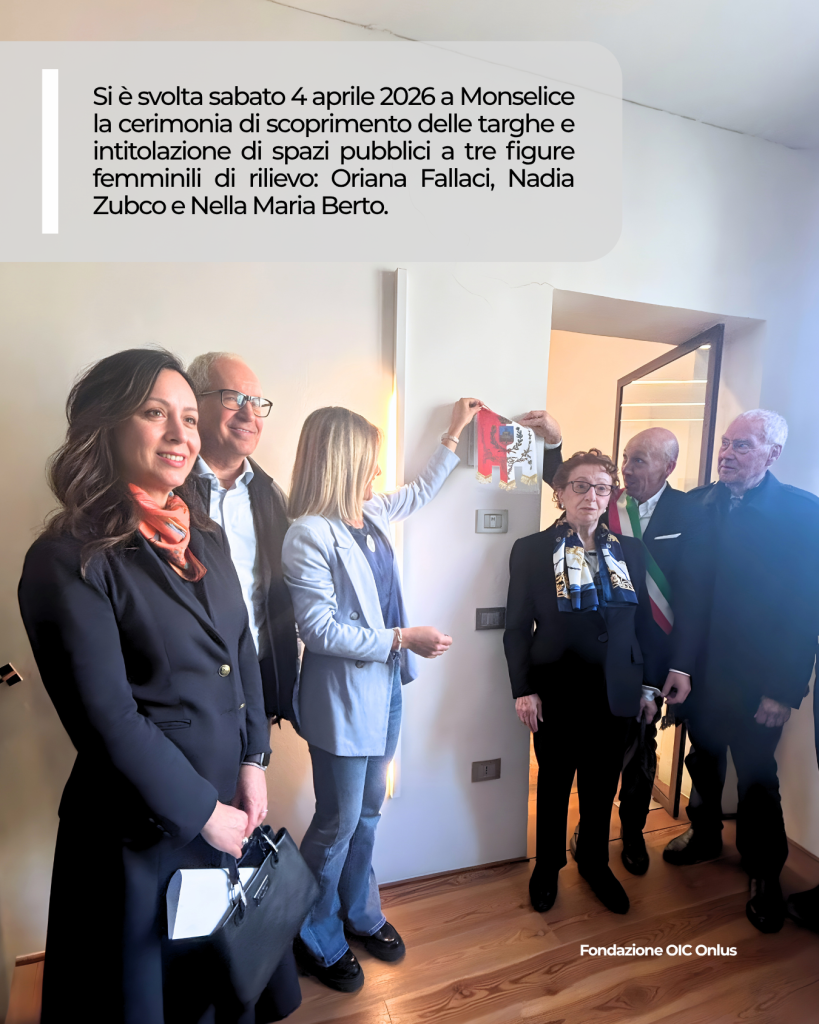 Nella giornata di sabato 4 aprile 2026, la Fondazione Opera Immacolata Concezione Onlus ha preso parte alla cerimonia di scoprimento delle targhe e di intitolazione di spazi pubblici promossa dal Comune di Monselice, dedicata a tre figure femminili di alto valore civile, sociale e culturale: Oriana Fallaci, Nadia Zubco e Nella Maria Berto.