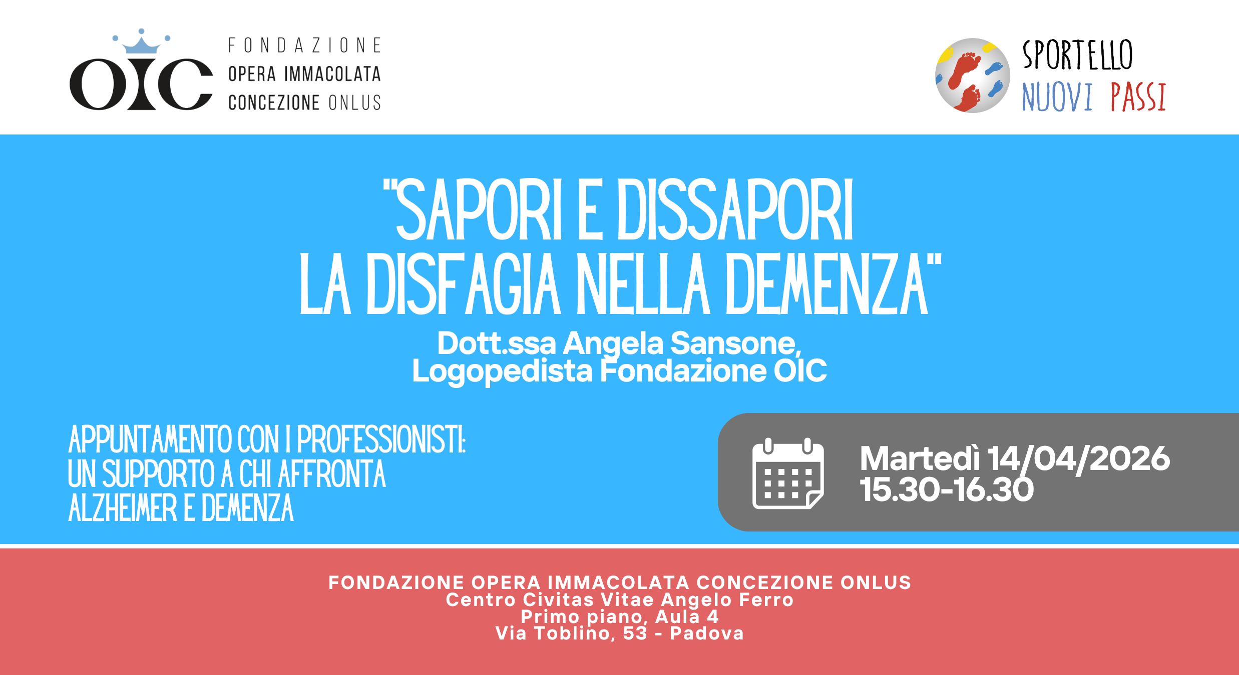 L’incontro “Sapori e dissapori: la disfagia nella demenza” si terrà martedì 14 aprile 2026, dalle ore 15.30 alle 16.30, presso la Civitas Vitae Angelo Ferro di Padova (primo piano, Aula 4).