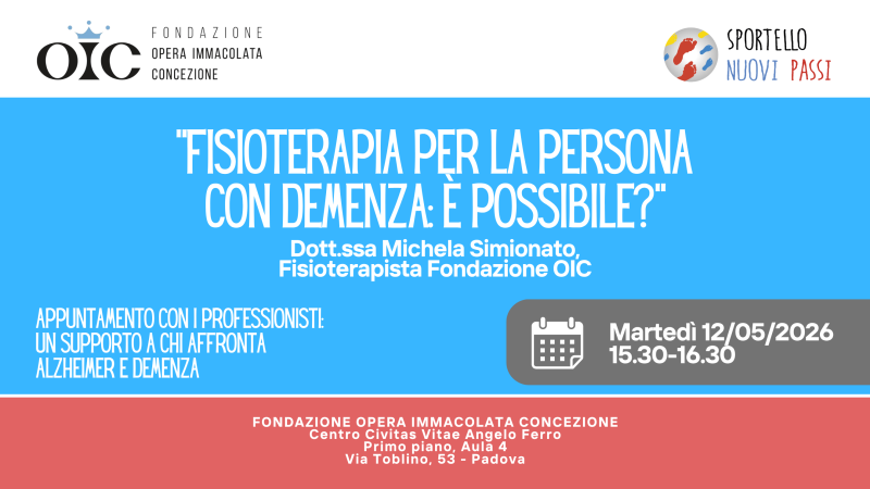 Prosegue il calendario di incontri promossi dallo Sportello Nuovi Passi della Fondazione Opera Immacolata Concezione Onlus, un progetto pensato per offrire supporto concreto, informazioni e strumenti pratici a chi si trova ad affrontare l’Alzheimer o altre forme di demenza. Dopo il primo appuntamento del 14 ottobre, dedicato ai “Sintomi della demenza e come intervenire” con la Dott.ssa Michela Fernanda Rigon – Direttore Sanitario