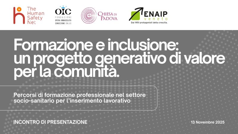 Formazione e inclusione: un progetto generativo di valore per la comunità. Corso gratuito per Operatore Socio-Sanitario dedicato a persone in situazione di fragilità, con l’impegno congiunto di Fondazione OIC, ENAIP Veneto, Caritas Padova e The Human Safety NetFormazione e inclusione: un progetto generativo di valore per la comunità. La Fondazione Opera Immacolata Concezione Onlus, ENAIP