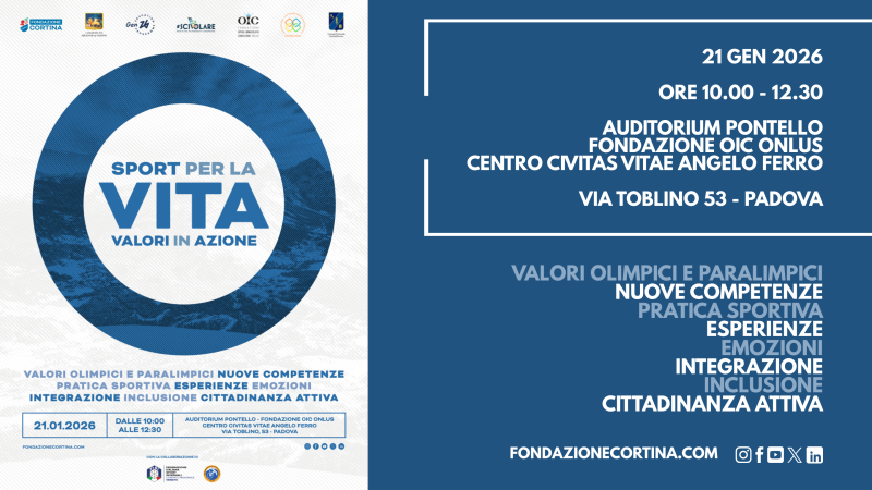Cortina d’Ampezzo, 21 gennaio 2026 – La Fondazione Opera Immacolata Concezione Onlus ha ospitato oggi, presso l’Auditorium Pontello del Centro Civitas Vitae Angelo Ferro di Padova, “Sport per la vita: valori in azione”, tappa padovana del “Progetto Scuole”, iniziativa educativa promossa da Fondazione Cortina, la realtà che organizza i grandi eventi sportivi nella Conca ampezzana, nell’ambito dell’Education Programme Gen26 dei